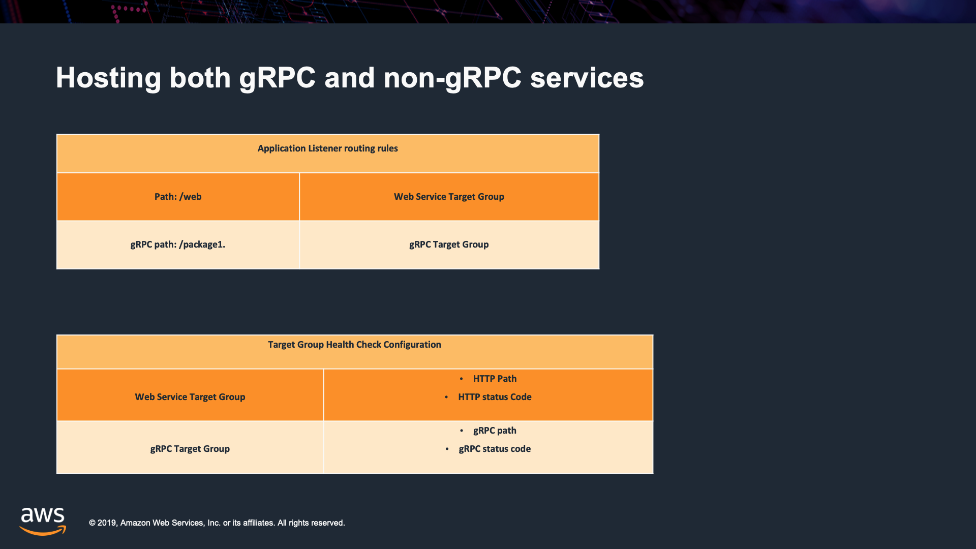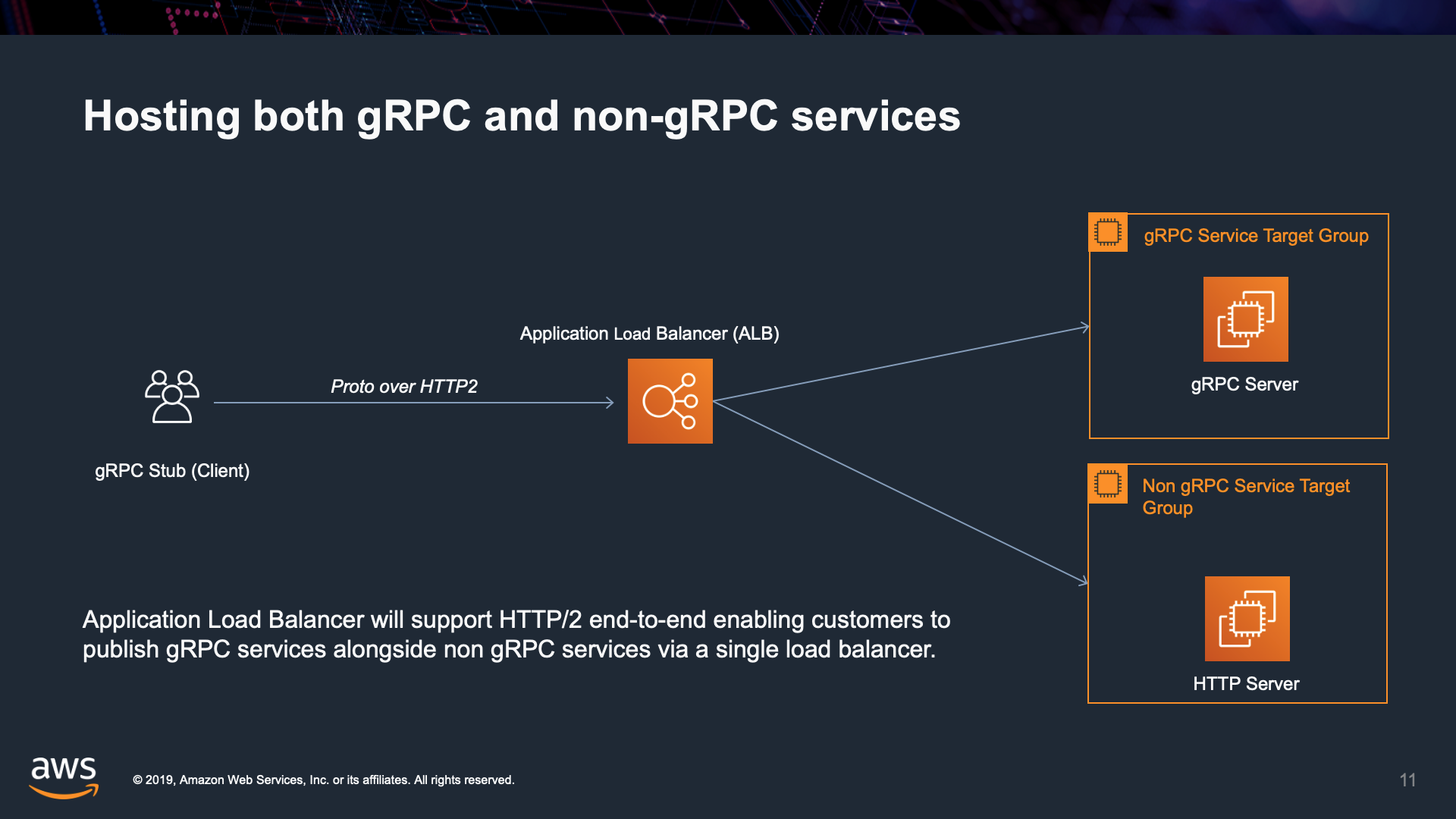 In the journey of breaking down monolithic application into microservices, gRPC has became a natural choice for intra-service communication due to its efficiency and language support. With ALB supporting gRPC, you can just front each of your gRPC services via ALB without deploying client proxies, service discovery or health check mechanisms.